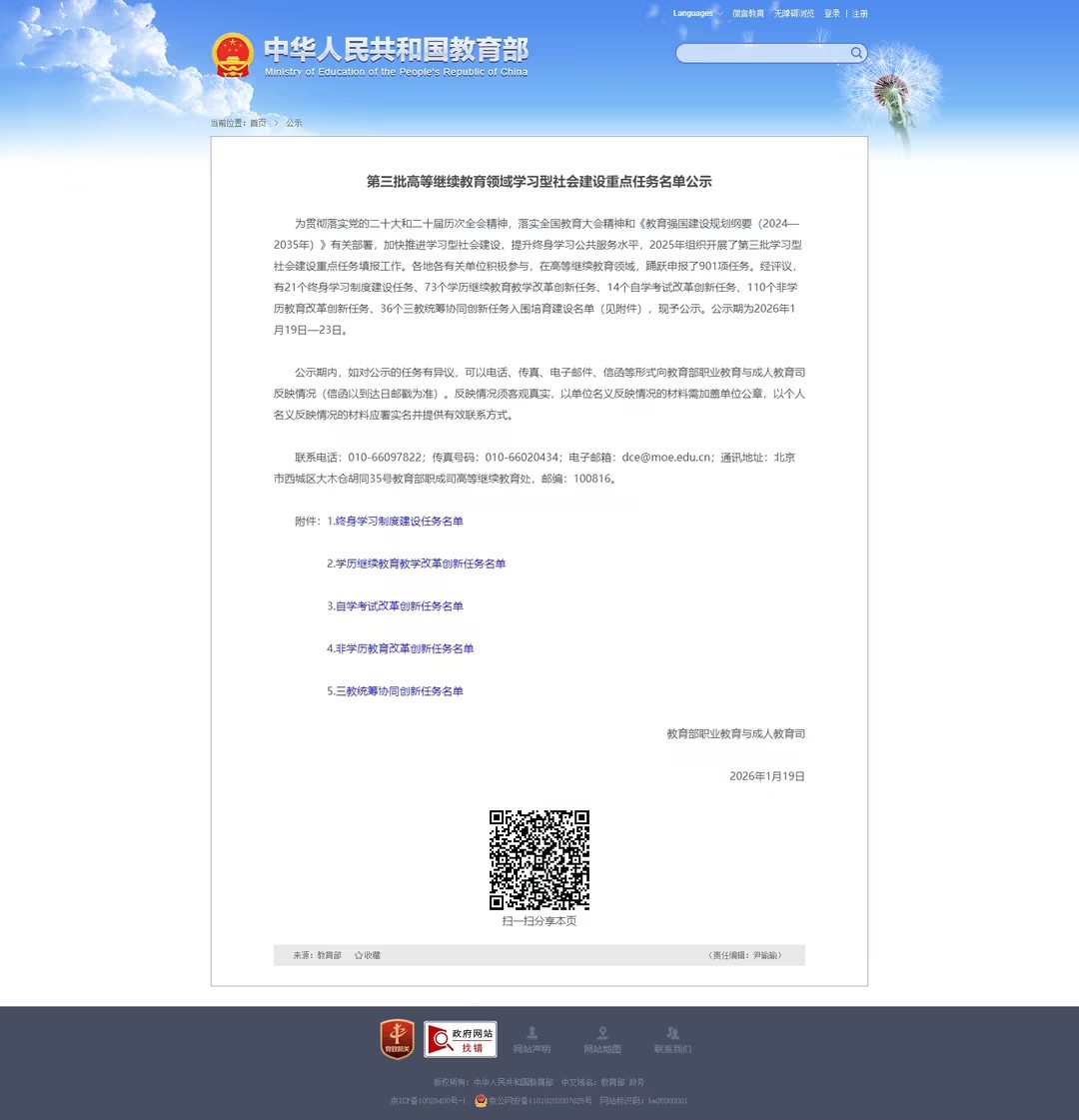 近日,教育部职业教育与成人教育司公示第三批高等继续教育领域学习型社会建设重点任务名单,我校申报的《基于全国数字低空行业产教融合共同体的三教统筹协同创新试点》项目成功入选。这是我校连续三年入选教育部高等继续教育重点任务,彰显了学校在深化产教融合、服务全民终身学习方面的扎实积累与持续引领。