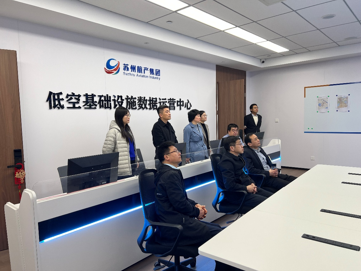 在苏州航产集团董事长褚宏伟、技术管理部门负责人魏昊天等陪同下,企业技术人员详细介绍了公司发展现状,重点展示了企业在低空基建与巡检领域的技术积累与产业化成果。调研组参观了企业自主研发的苏翼巡低空巡检平台,该平台已成功应用于苏州市多个区域的低空常态化巡检,展现了在复杂城市环境下的高效监测能力。此外,企业还展示了低空基础设施数据管理系统,该系统在智慧城市低空数据整合与智能调度方面具有显著优势。